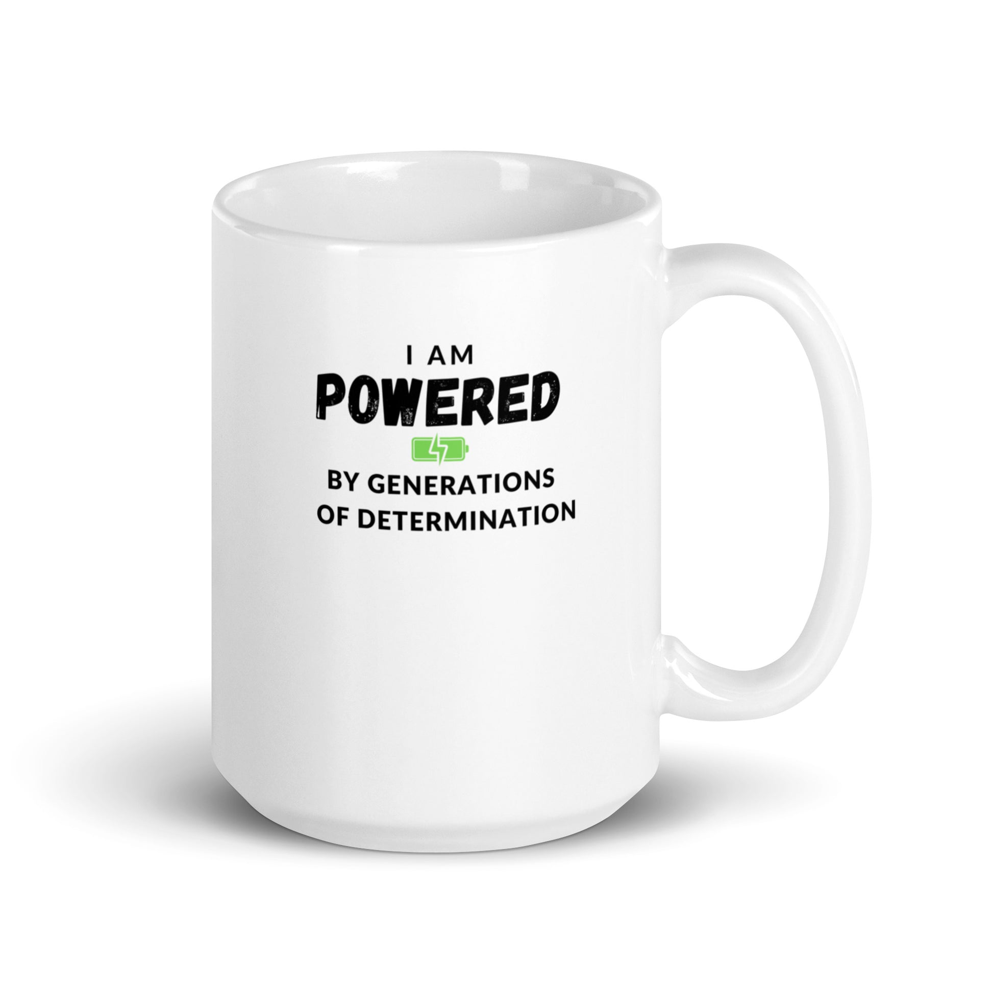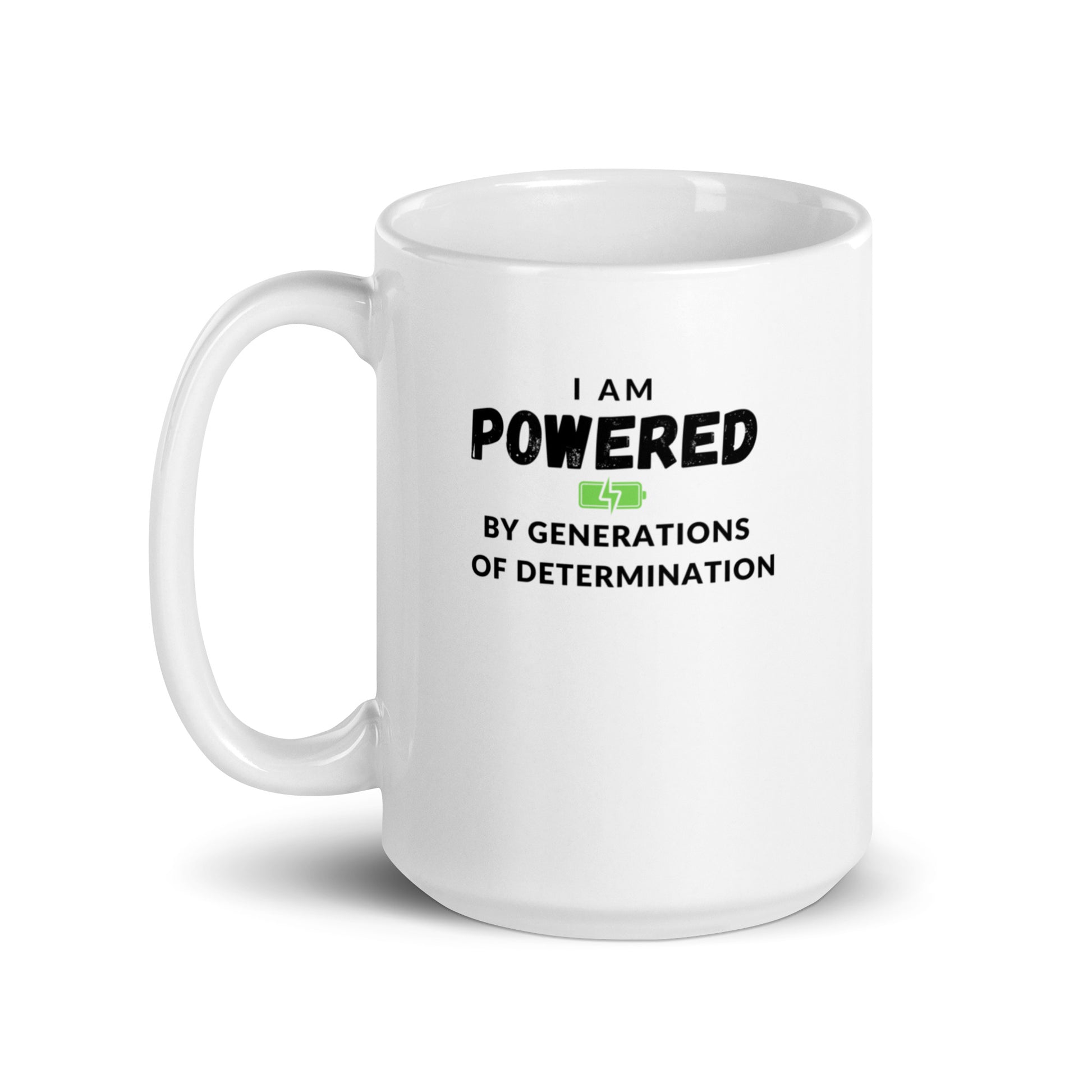 Love your morning coffee and evening tea? This I Am Powered by Generations of Determination White glossy mug gives you the perfect tool to enjoy them both! This 15oz ceramic mug is sturdy with a glossy finish that pops with a vivid print and is also microwave and dishwasher safe Boldness and beauty--what's not to love?